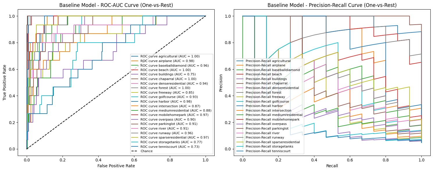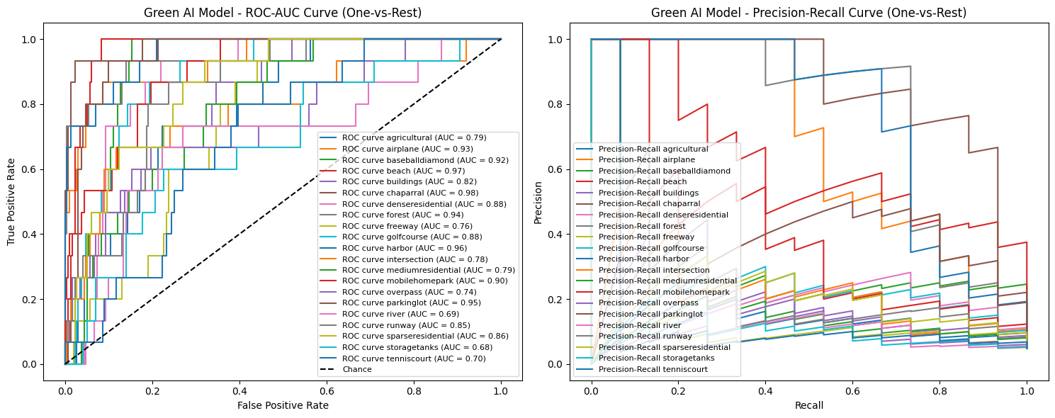 We evaluate models using stratified holdout sets and a battery of diagnostics (confusion matrices; per-class precision/recall; macro-F1; ROC and PR curves, one-vs-rest) and then map model predictions onto domain-relevant sustainability categories (e.g., ecosystem, water, transport, energy) to quantify actionable impact. This step illustrates how classification throughput improvements translate into real-world decision acceleration (faster detection of deforestation, urban sprawl, flood-risk areas) and therefore indirect environmental benefits beyond reduced training footprints.