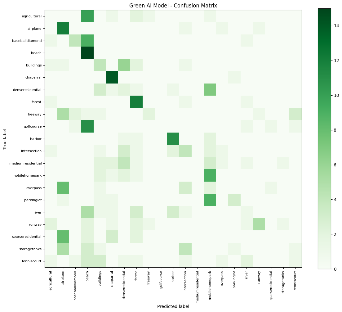 Our experiments show that high accuracy and low environmental impact are compatible when models and systems are co-designed for efficiency. For example, the Micro-CNN attained ~91% of the baseline CNN’s accuracy while consuming only ~14% of the energy; transfer-learning models reached >97% of baseline accuracy with roughly 25–30% of its energy [1]. These holdout-set results (Figs. 1.4–1.5) confirm that lightweight, well-engineered models can capture most of the useful signal at a fraction of the cost. The per-class confusion matrices (Figs. 1.7–1.9) likewise show balanced performance across categories, indicating no systematic loss of predictive power. Crucially, the carbon impact benchmarks (Fig. 1.10) quantify the payoff: classical models emitted only ~0.003–0.005 kg CO₂e per run versus ~0.079 kg for the large CNN baseline (a >20× reduction)[2]. This dramatic variation underscores that environmental cost must be weighed alongside accuracy. In sum, our results empirically substantiate the core argument that “Green AI” is achievable: by deliberately integrating low-impact training configurations (chunked loading, float16) and hardware-aware efficiency, we attain near-baseline performance with greatly reduced emissions. These findings align with recent calls for balancing performance and energy use in ML [16], and they demonstrate the practical viability of Pareto-efficient model design in remote sensing (i.e., maximizing accuracy per watt).