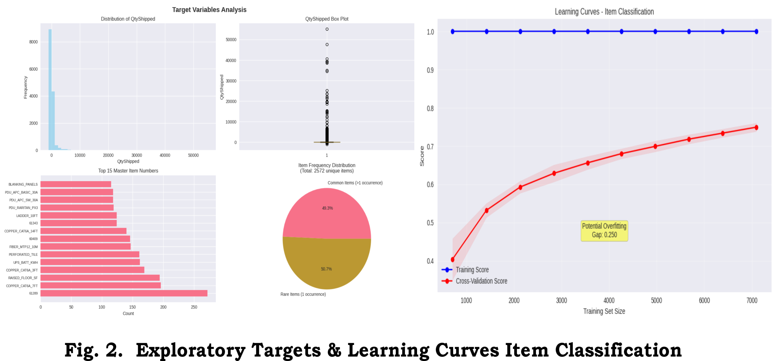 Exploratory analysis revealed a long-tailed distribution of MasterItemNo (the top 20 items cover a large fraction of transactions) and a right-skewed QtyShipped distribution. Figure 1 displays the correlation matrix and complementary EDA visuals. We used these diagnostics to determine log-transforms and to remove highly collinear numeric features where appropriate.