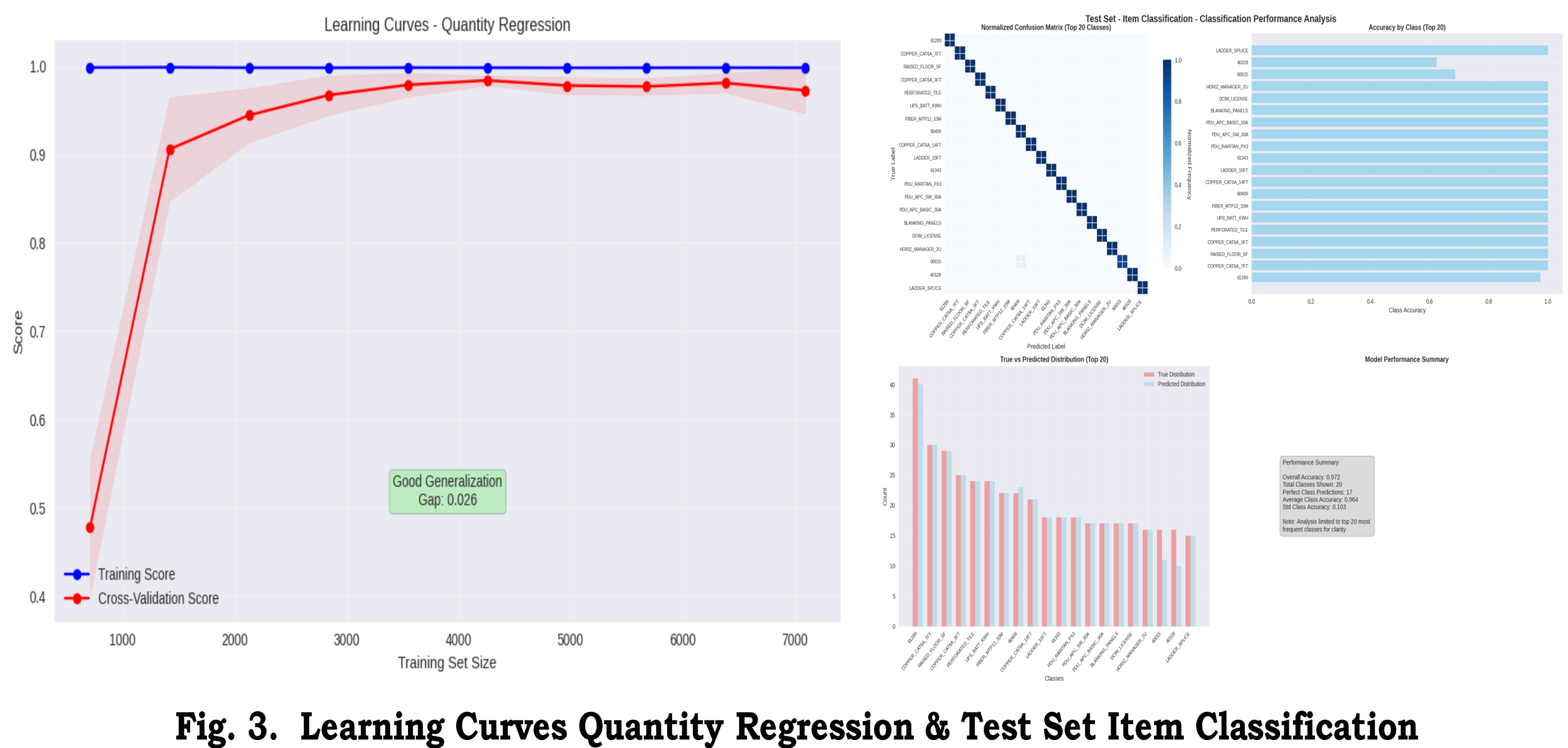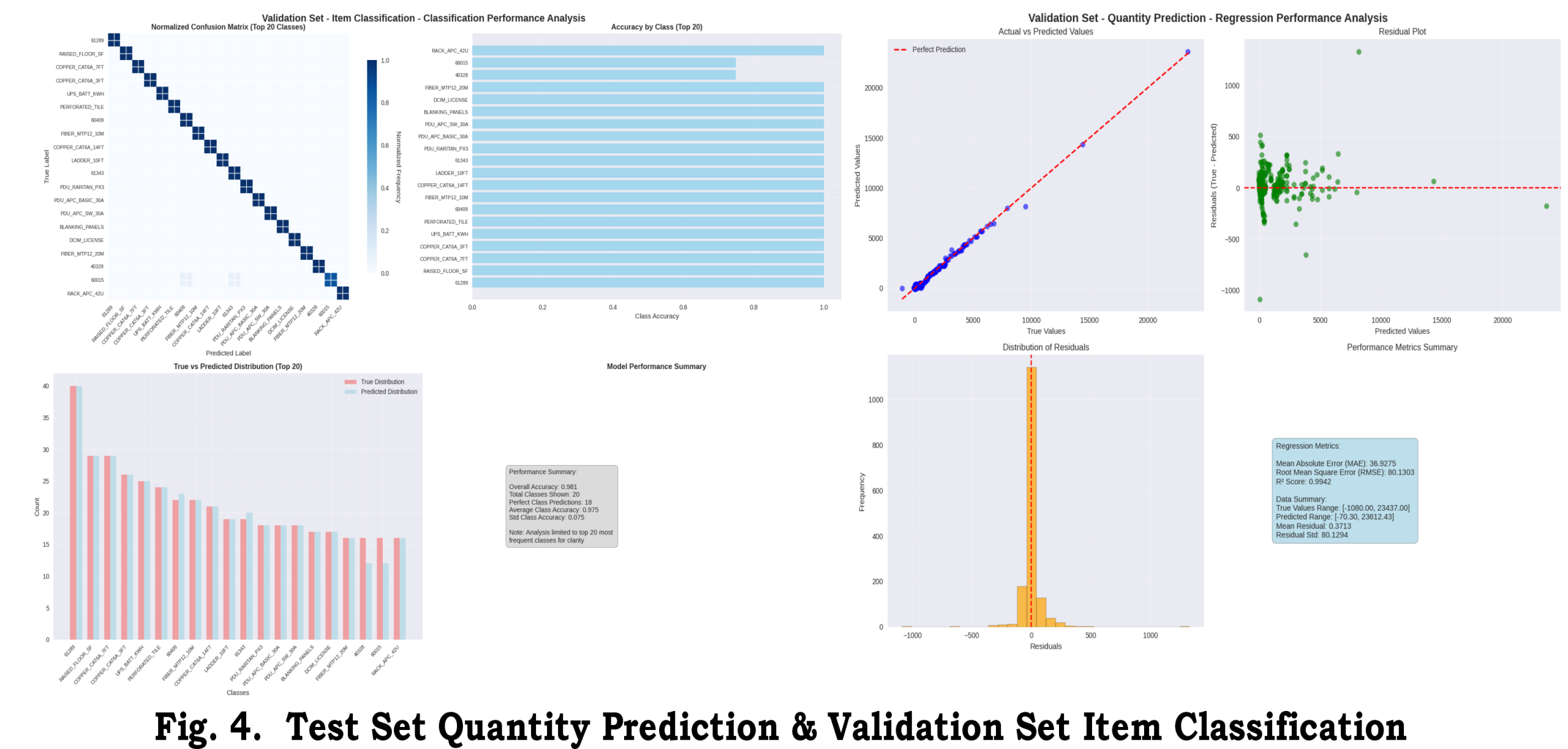 Beyond model architecture, this work contributes new interpretability and diagnostic tools tailored to the operational setting. We provide enhanced learning curves, residual-error plots, normalized confusion matrices, and item-class-specific prediction trend figures (Figures 1–5) to analyze performance in depth. For example, the normalized confusion matrices (Fig. 2) reveal which item classes are frequently misclassified, guiding targeted data augmentation or model tuning. The residual plots (Fig. 3) expose biases in quantity predictions across different items, indicating systematic under- or over-forecasting. Item-class-wise trend plots (Figs. 4–5) visualize how predicted quantities compare to actuals over time for each product, highlighting patterns that aggregate metrics would obscure. Such diagnostic visualizations—common in model engineering but seldom reported in supply-chain ML studies—provide practitioners with actionable insight. Prior work in supply-chain forecasting often relies on black-box accuracy metrics or advanced methods like SHAP to interpret models [3], but has not emphasized these classic evaluation plots. Our figures bridge this gap by making model behavior transparent to domain experts, facilitating trust and iterative improvement.